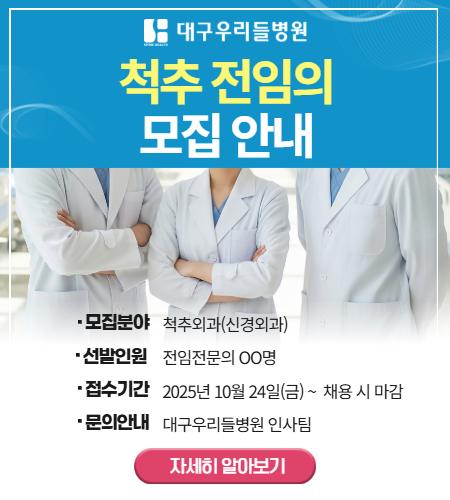 최근 본원의 신경외과 전문의 김상훈 부과장은 전임의 연수 과정을 성공적으로 수료하시며 신임 부과장으로 발령 받으셨는데요. 김상훈 부과장은 이번 대구우리들병원 수련 과정을 통해 신경성형술치료 등의 비수술적인 치료 전반과 내시경을 이용한 디스크 및 협착증 치료 (UBE, ,단방향 척추 내시경) 미세현미경 수술 및 고난이도 척추 유햡술(ALIF, OLF등)까지 척추 질환 치료의 전 영역을 아우르는 임상 경험과 최신 술기를 습득 하였습니다. 이를 통해 환자의 상태와 질환의 특성에 따라 가장 적합한 치료 방법을 선택할 수 있는 전문 역량을 갖추게 되었는데요. 대구우리들병원에서는 첨단 의료 인프라와 숙력된 의료진을 바탕으로 환자의 고통을 최소화하고 빠른 회복을 돕는 최소절개 척추 전문 치료를 선도하기 위해 노력하고 있습니다. 특히 이번 김상훈 전임의에 부과장 임명은 본원이 한단계 더 도약하는 중요한 계기가 되지 않을까 싶은데요. 앞으로도 대구우리들병원은 환자 중심의 척추 치료와 꾸준한 연구를 통해 보다 나은 의료서비스를 제공할 수 있도록 최선을 다하겠습니다.